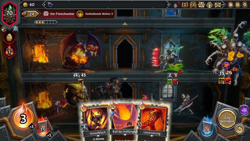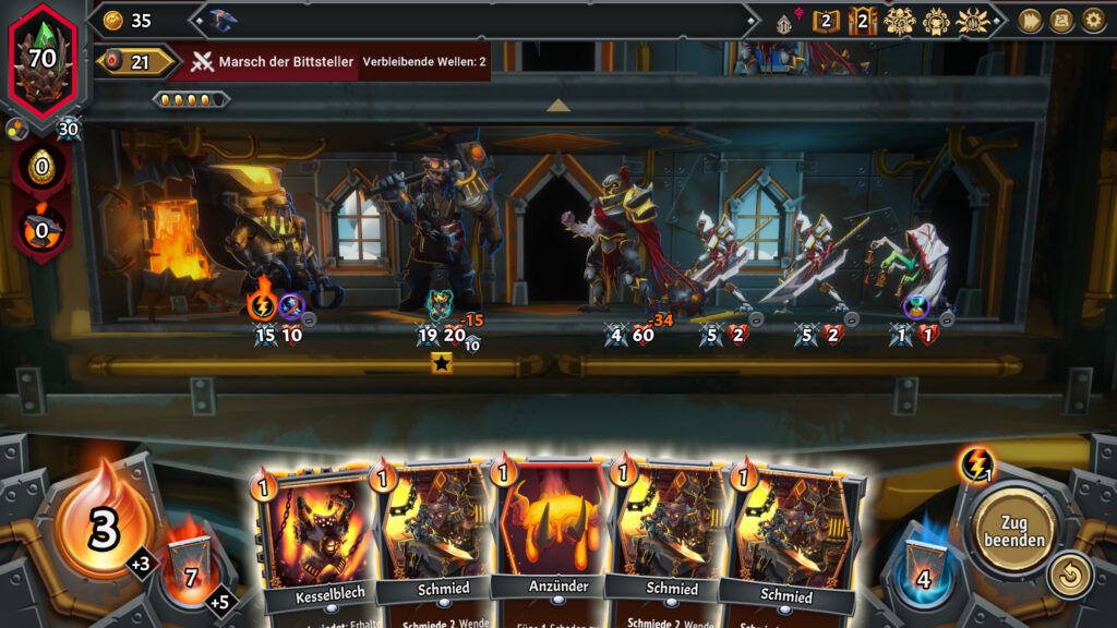 Der erste Teil des DLC ist die neue Fraktion der Gleisschmiede. Und der Name ist Programm! Ihre Hauptfähigkeit ist das Schmelzen und Schmieden. Mit dem Schmelzen könnt ihr Karten aus eurer Hand in Energie und Schmiedepunkte umwandeln. Zudem gibt es einige Einheiten, die euch Schrott auf die Hand geben. Das sind Karten, die ihr weder am Ende eures Zuges abwerft, noch direkt ausspielen könnt. Allerdings erhöhen sie ihren Schmelzwert jede Runde um 1. So könnt ihr dank ihnen und einem gut getimten Einsatz von Schmelzen richtig große Kombozüge durchführen.