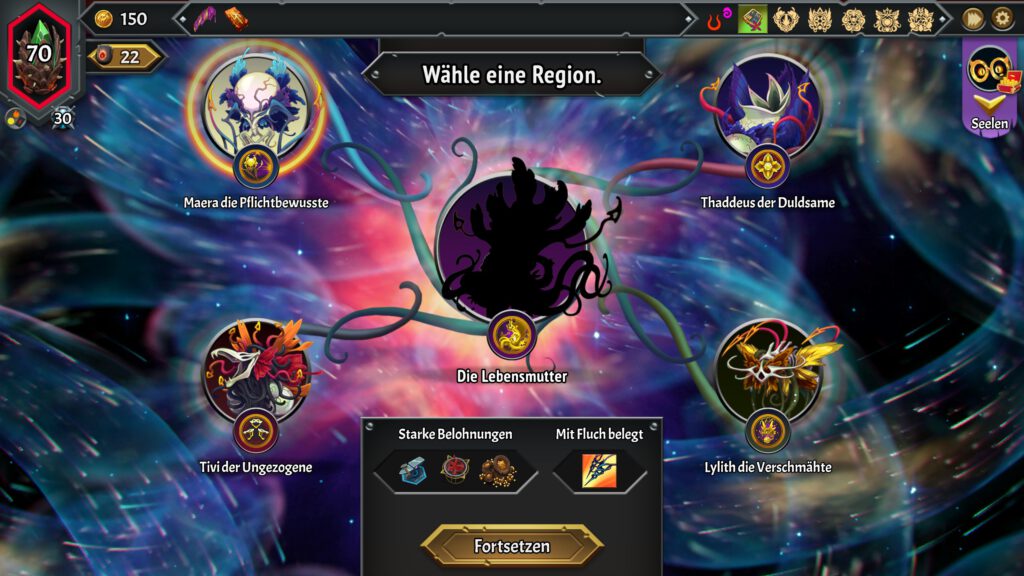 © Big Fan Games / Shiny ShoeAnschließend könnt ihr euch anders wie im Hauptmodus frei aussuchen, welchen der vier Bosse ihr in welcher Reihenfolge erledigen möchtet, bevor ihr dem großen Endgegner der Seelenmutter gegenübertretet. Dabei könnt ihr auch immer sehen, welche Belohnungen auf euch warten, solltet ihr den Kampf gewinnen. Und hier ist auch die andere große Neuerung: Der Schwierigkeitsgrad. Um zu kompensieren, dass ihr mit einem deutlich besseren Deck startet, sind auch alle Gegner und Bosse deutlich kniffeliger. Um genau zu sein, sogar so kniffelig, dass ich in meiner bisherigen Testphase es noch nicht ein Mal geschafft habe, die Seelenmutter zu besiegen. Allerdings macht der Modus durch die Möglichkeit, seine Startkarten direkt am Anfang in eine gewisse Richtung zu lenken, eine Menge Spaß. So könnt ihr gezielt verschiedene Taktiken ausprobieren und zum Ziel bringen. Mit der Zeit schaltet ihr auch immer neue Modifikatoren frei, wodurch das Spielgefühl frisch bleibt.