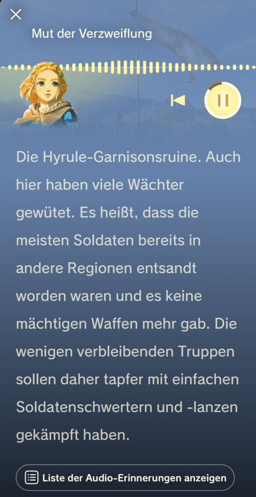 Die Audio-Erinnerungen sind das zweite Highlight. Durch diese erhalten wir zusätzliche Infos voll vertont von Prinzession Zelda an bestimmten Orten, sodass eingefleischte Fans wohl auf ihre Kosten kommen werden. Schade ist am Ende nur, dass diese beiden wirklich tollen Funktionen nicht direkt in das Spiel selbst integriert sind, sondern ein zusätzliches Gerät samt App benötigen.