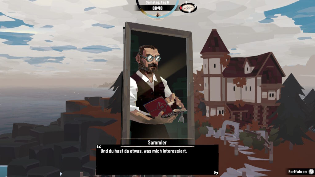Diese Verbesserungen erweitern dann den einst kleinen Raum, den ihr erkunden könnt auf ein großes Meer mit vier großen und allerlei kleinen Inseln und Orten. Allesamt sind abwechslungsreich gestaltet und vor allem die vielfältigen Charaktere machen dabei enorm viel Spaß und bewegen dazu, tiefer in die Geschichte von Dredge eintauchen zu wollen. Dank eurer optimierten Ausrüstung könnt ihr aber auch schneller an Geld kommen, wenn ihr beispielsweise Netze einsetzt, um gleich mehrere Fische automatisiert einzufangen. Dieser sich stetig entwickelnde Spielflow ist für mich der Hauptgrund, warum ich so motiviert in das Abenteuer eintauchen konnte.