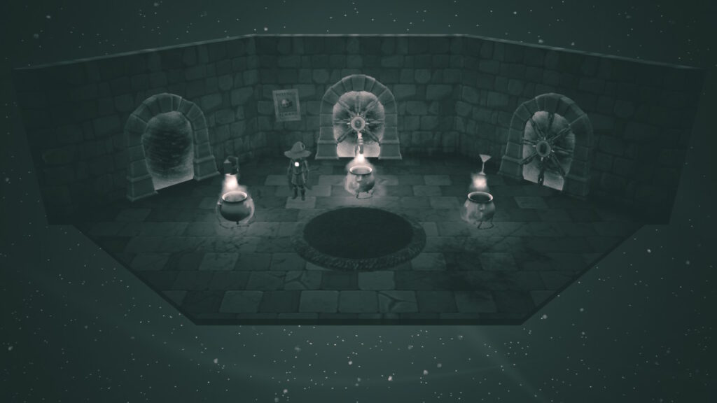 Das Einzige, das etwas an einen Eckpfeiler erinnert, ist der zentrale Raum. Stellt euch einfach die Situation aus Der Herr der Ringe vor in der die Gemeinschaft in Moria nicht weiß, welchen der drei Pfade sie gehen müssen. Ähnlich dieser Film- und Buchszene finden wir hier einen zentralen Raum. Von hier aus wählen wir eine Art Szenario aus, wobei der Begriff Szenario schon sehr weit gegriffen ist. In jeder Ebene müssen wir bestimmte Sammelobjekte finden, welche am Ende im jeweiligen Kessel landen und für mich so ein bisschen für den Spielfortschritt stehen. Zusätzlich bietet jeder dieser Abzweigungen ein eigenes Spielthema oder auch Spielsetting.