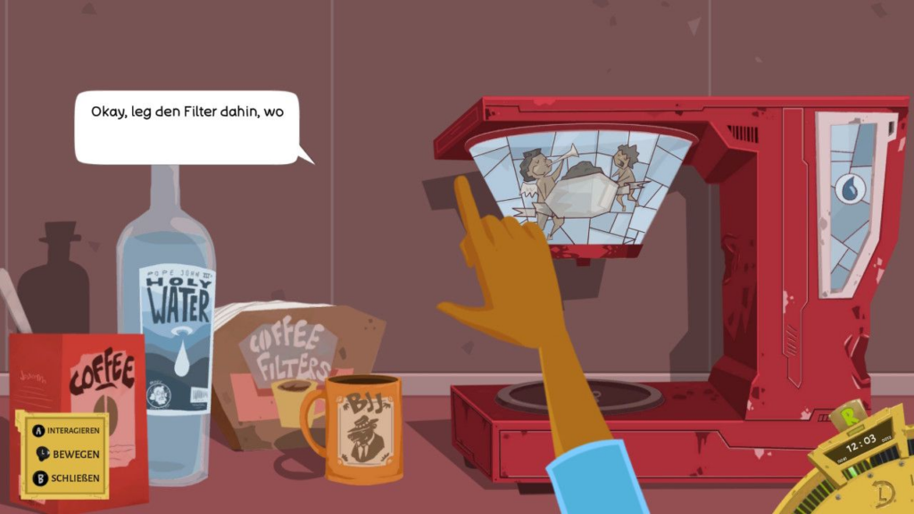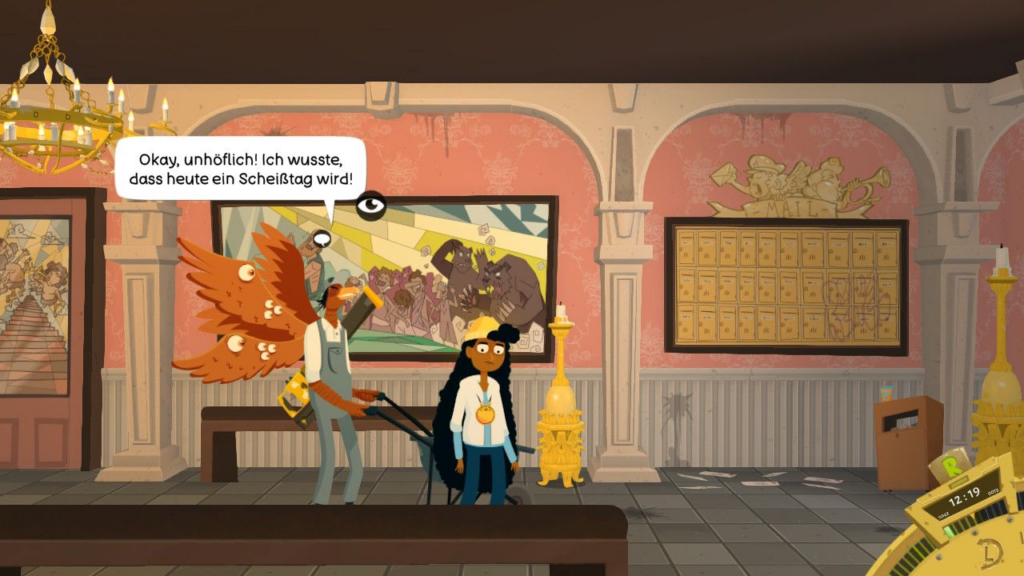 Was mich von Anfang an begeistert hat, ist die herrlich schräge Atmosphäre des Spiels. Die Entwickler haben sich hier eindeutig von dem Schwarzen Humor bei Rick and Morty inspirieren lassen. Die Charaktere sind skurril, die Dialoge sind vollgestopft mit Sarkasmus und schwarzem Humor und die absurden Aufgaben sind einfach nur zum Schmunzeln.