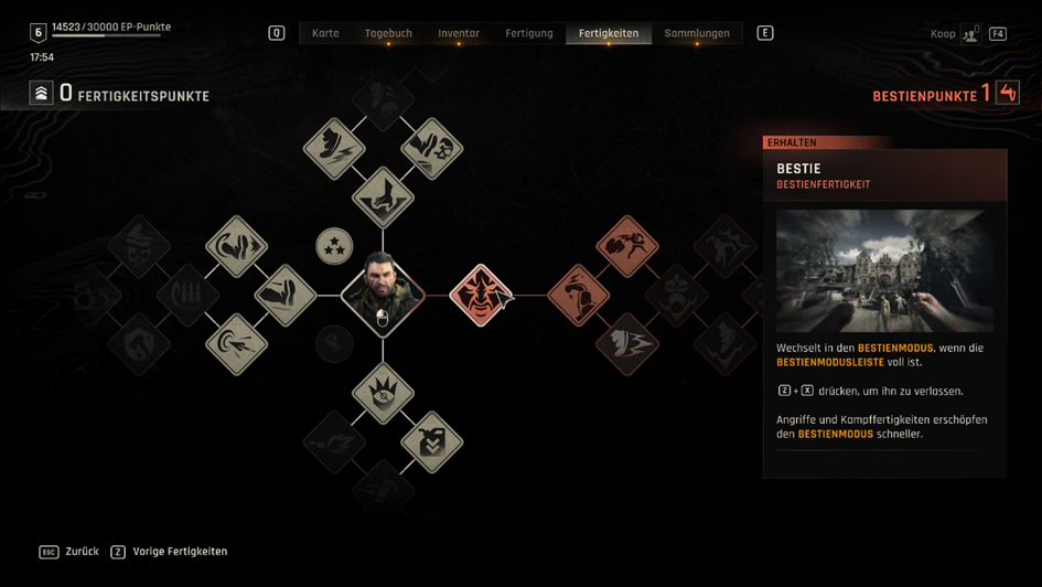 © TechlandRichtig neu ist der Skilltree für das innere „Biestsystem“. Um diese Mutation zu verbessern, muss man besondere Gegner besiegen, aus denen man ein Serum gewinnt. Das sorgt zwar für zusätzliche Motivation, verlangt aber auch Mut, denn gerade diese Gegner gehören zu den härtesten im Spiel. Ohne genug gesammelte Materialien, Upgrades oder Crafting-Ressourcen kommt man hier kaum voran, looten und investieren gehört fest zum Gameplay dazu.