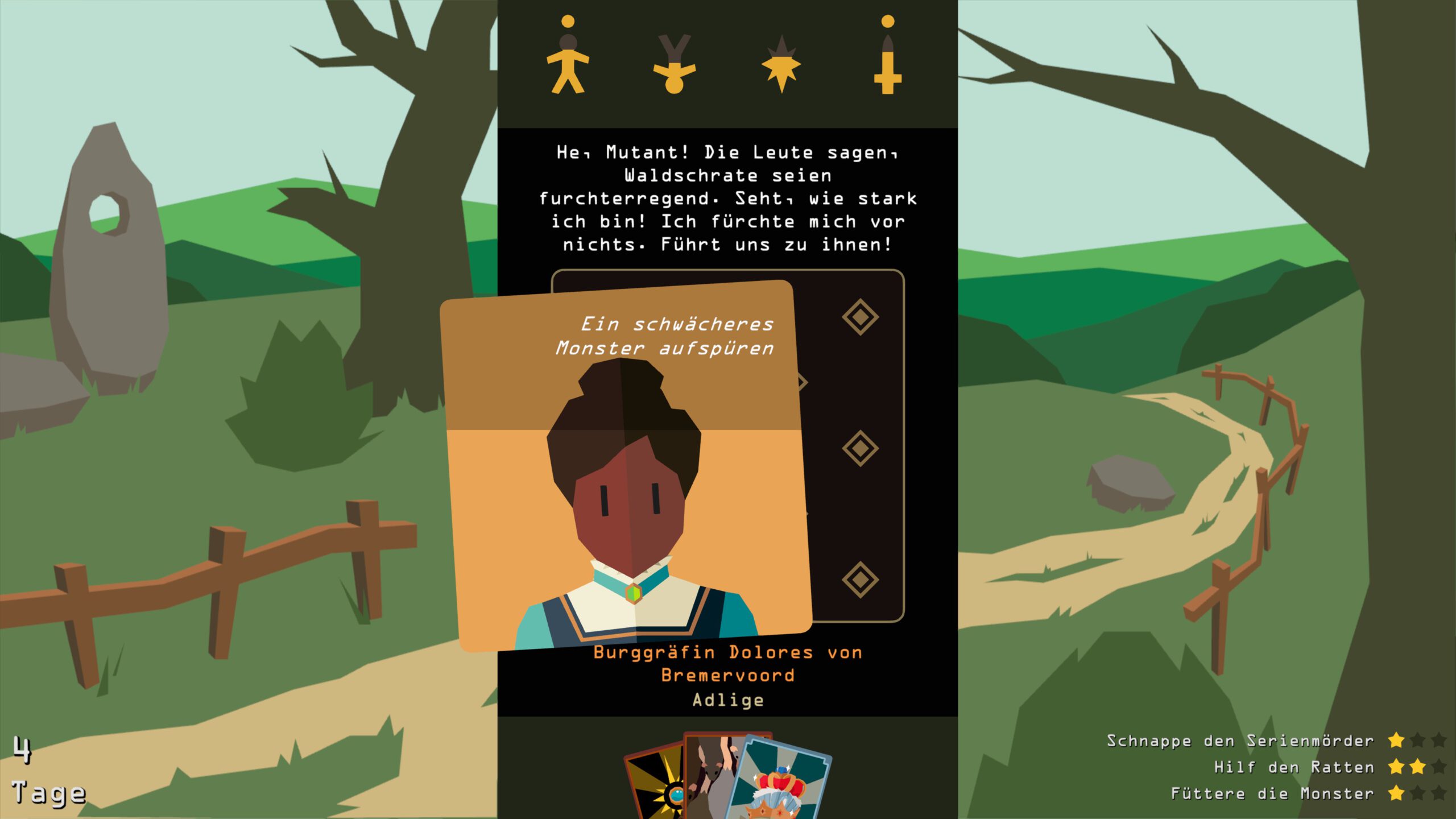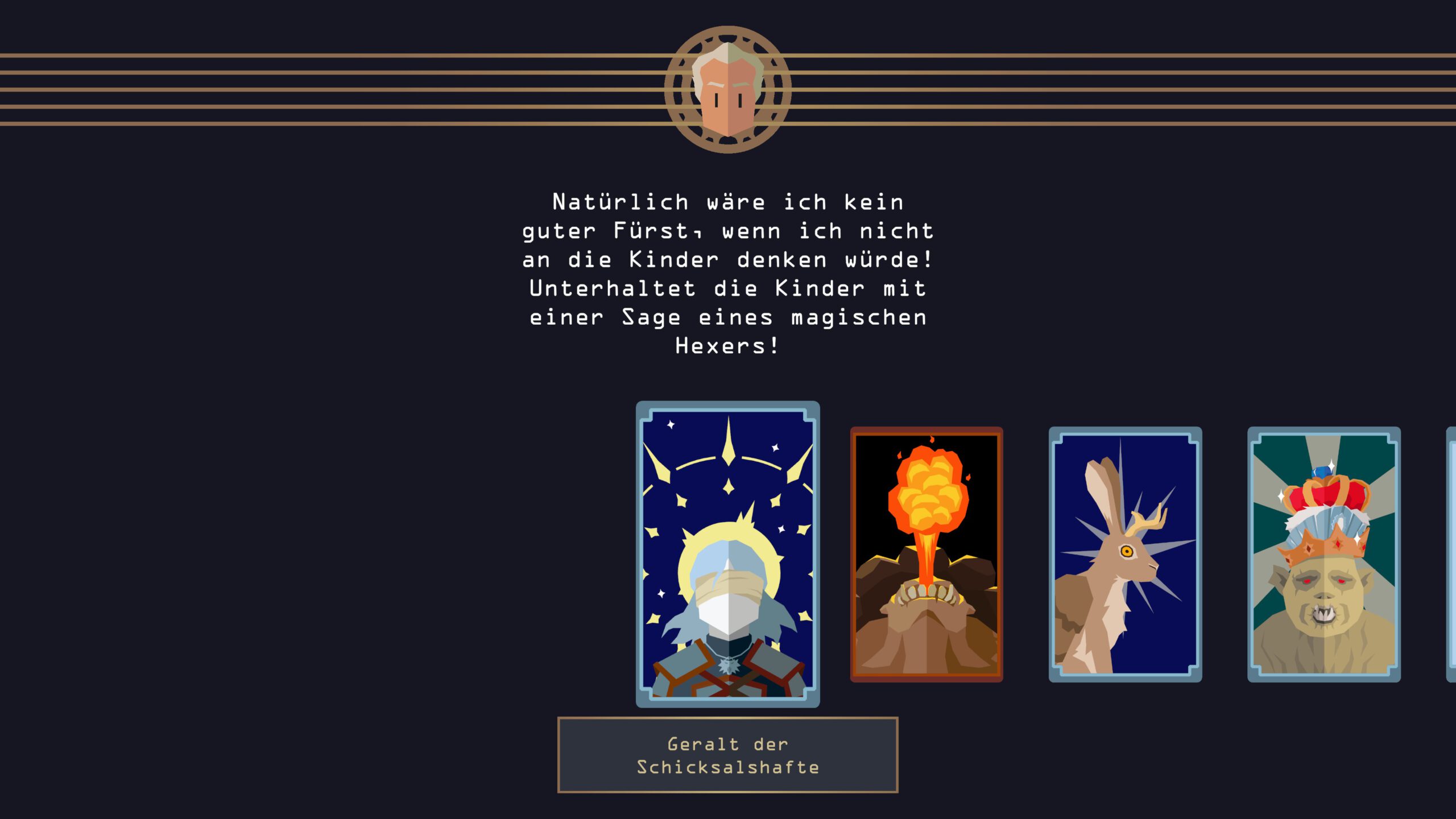 © Devolver DigitalWie bei den Reigns-Spielen typisch, besteht unsere Aufgabe darin, mit unseren Entscheidungen die Story voranzutreiben. Dabei können wir immer zwischen zwei möglichen Reaktionen wählen und die Story-Karte in der Bildschirmmitte entweder nach links oder rechts wischen. Hierbei müssen wir jedoch stets vier Attribute im Blick behalten: sind Menschen Geralt wohlgesinnt, sind nichtmenschliche Geralt wohlgesinnt, sind Zauberer Geralt wohlgesinnt und zu guter Letzt wie konzentriert folgt Geralt dem Pfad der Monsterjäger. Doch Achtung, keines der vier Attribute, welche in Form von vier unterschiedlichen Symbolen am oberen Bildschirmrand angezeigt werden, dürfen vollständig gefüllt oder leer werden. Geschieht dies, ist unser Durchlauf vorbei und Rittersporn beendet die Ballade mit Geralts Tod oder einem anderen schlimmen Ausgang.