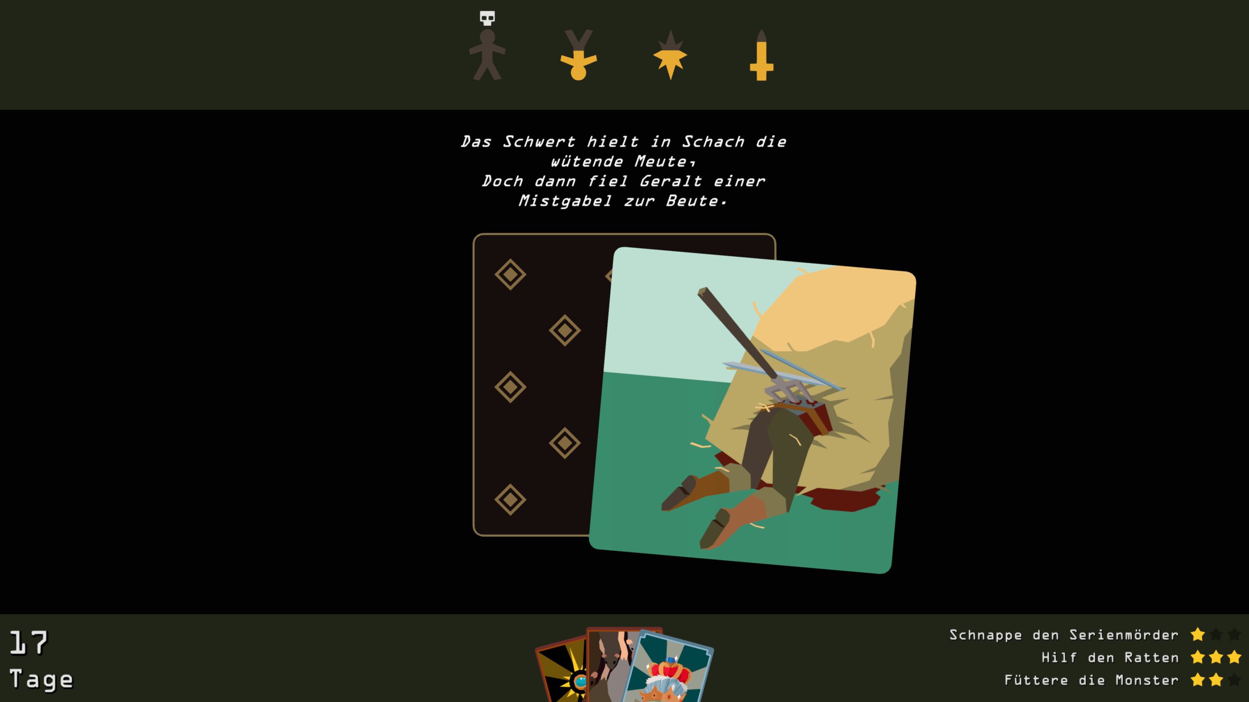 © Devolver Digital Ziel des Spiels ist es insgesamt, durch unsere Entscheidungen die Ballade Rittersporns möglichst lange am Laufen zu halten. Je nach durchgehaltenen Tagen und abgeschlossenen Aufträgen erhalten wir Punkte, die wir in unserem nächsten Durchlauf versuchen können, zu überbieten. Wer stets nach neuen Highscores lechzt, wird dabei motiviert. Jedoch hätten wir uns an einigen Stellen etwas mehr Tiefe gewünscht.