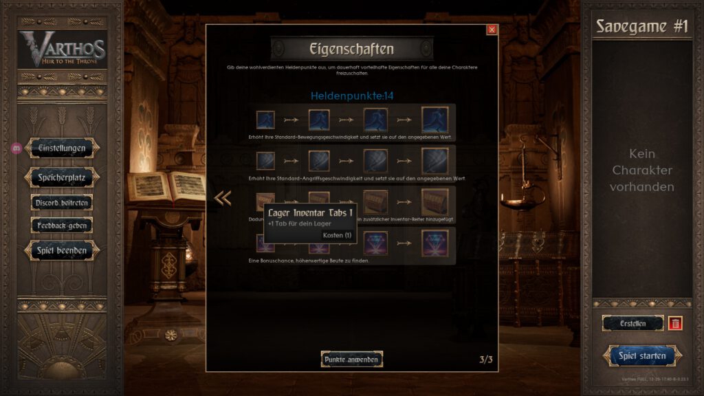 In der Überschrift wird es eigentlich schon deutlich, damit man Fortschritte erzielen kann, gibt es die Möglichkeit, den Charakter nach jeder Runde zu verbessern. Dies geschieht über sogenannte „Heldenpunkte“. Sie können eingesetzt werden, um die Grundwerte, wie bspw. Vitalität, zu erhöhen oder den geringen Platz im Inventar oder der Truhe zu erweitern. Das hilft natürlich enorm und hat bei mir dazu geführt, dass ich in den Welten gut vorwärts kam. Nachteil war zu meinem Zeitpunkt, dass ausgegebene Werte nach einem Durchgang wieder neu verteilt werden mussten. In Bezug auf mehr Lagerkapazität und Inventarplatz hat sich das für mich nicht wirklich erschlossen. Es könnte aber sein, dass es am derzeitigen Entwicklungsstand lag.