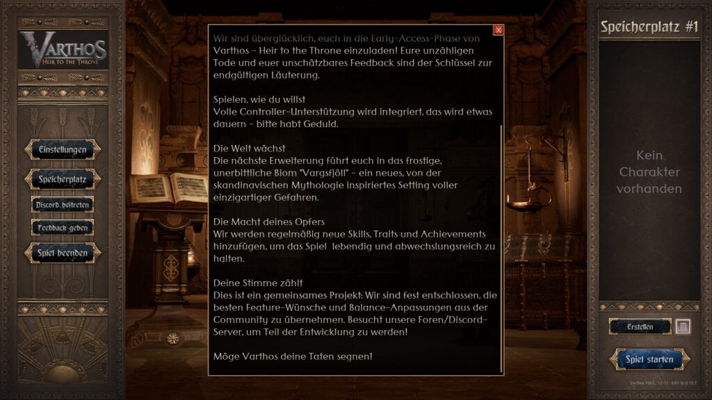 Zur Zeit kann man das Spiel ausschließlich mit der Tastatur spielen. Auch das funktioniert reibungslos. In all meinen Durchgängen hatte ich keinerlei Probleme damit. Ich denke aber, dass Varthos: Heir to the Throne wunderbar mit Controller spielbar sein wird. Drehungen, Angriffe oder Abwehrrollen würden eventuell geschmeidiger ablaufen. Die Entwickler von Nightshift Game Development haben in den In-Game-News angekündigt, dass sie bereits an einer Umsetzung für den Controller arbeiten. Man darf sich auch hier schon auf neue Inhalte freuen.