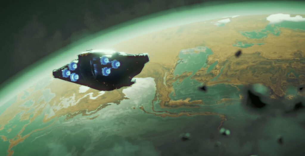 Raumschiff fliegt auf unbekannten Planeten zu.